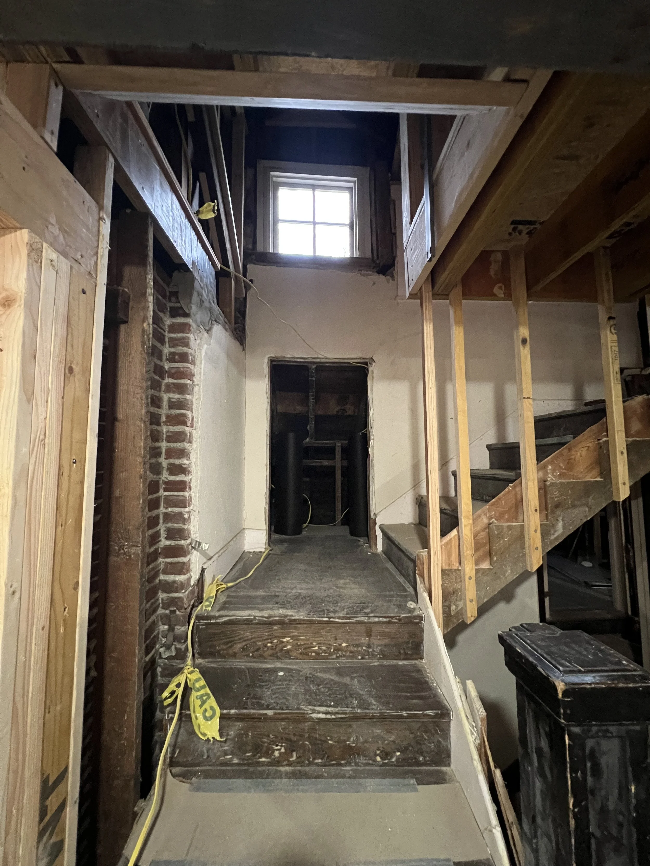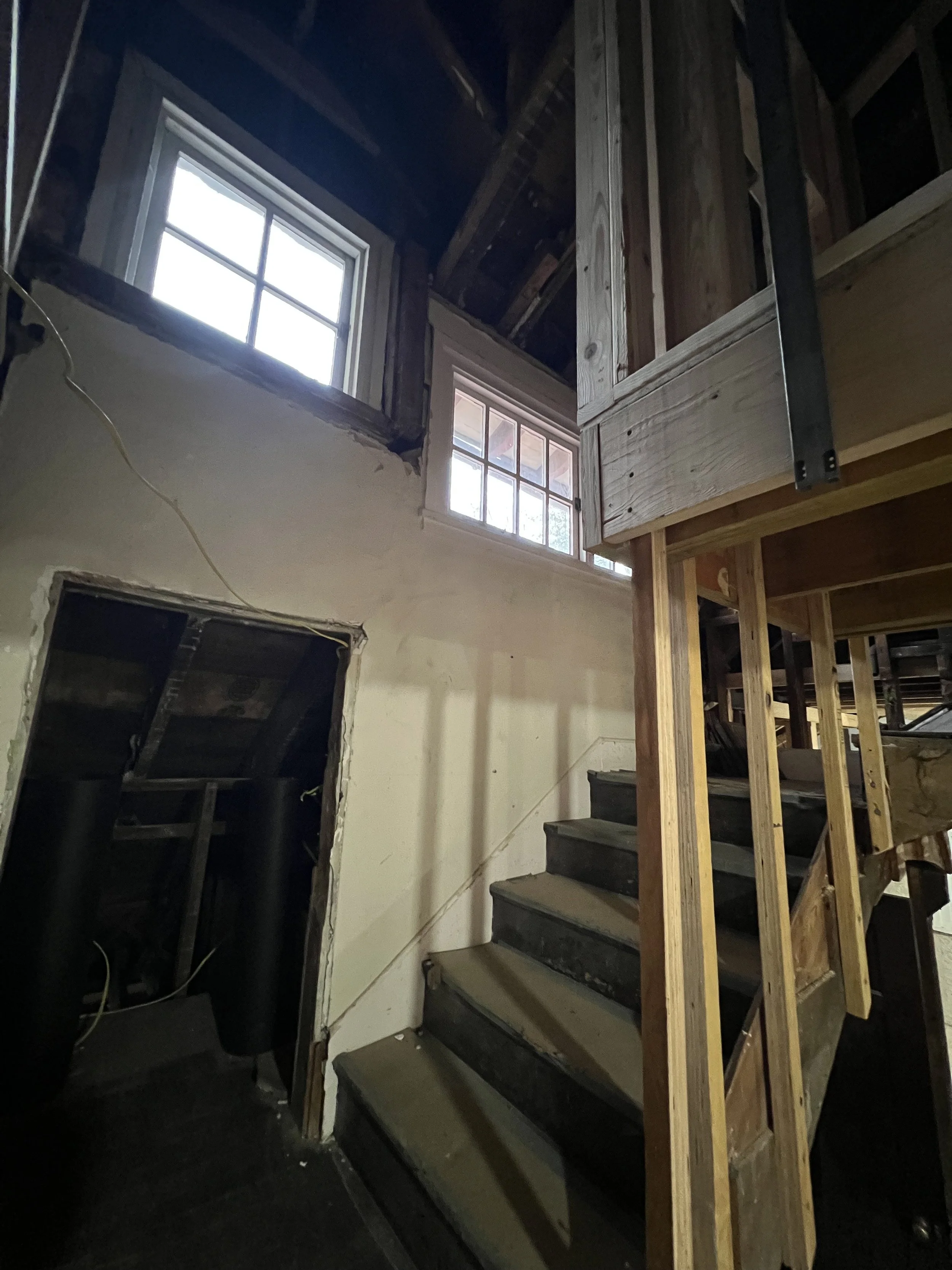 The gray steel beam is shown at the very top of this picture. Most remarkable is that support beams and reinforced framing from the basement up to the roof have straightened the tilted staircase. I love that we can see that window and allow more light here. Who doesn’t love more light??