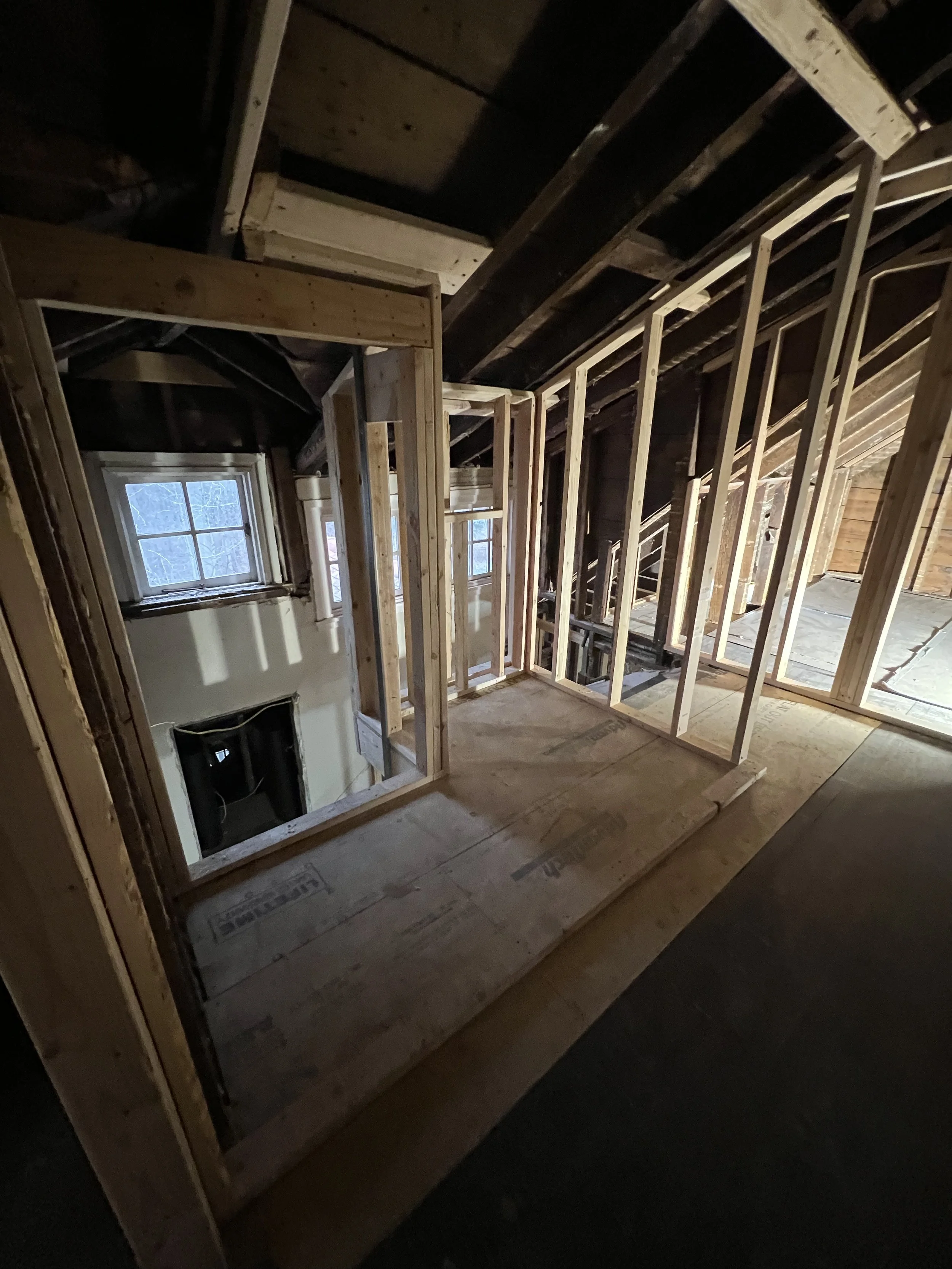 View of the opened staircase and third-floor bathroom (not fully framed yet). No more sunken shower or low ceiling. This space will now be a toilet and vanity with a shower room across the hall (not shown).