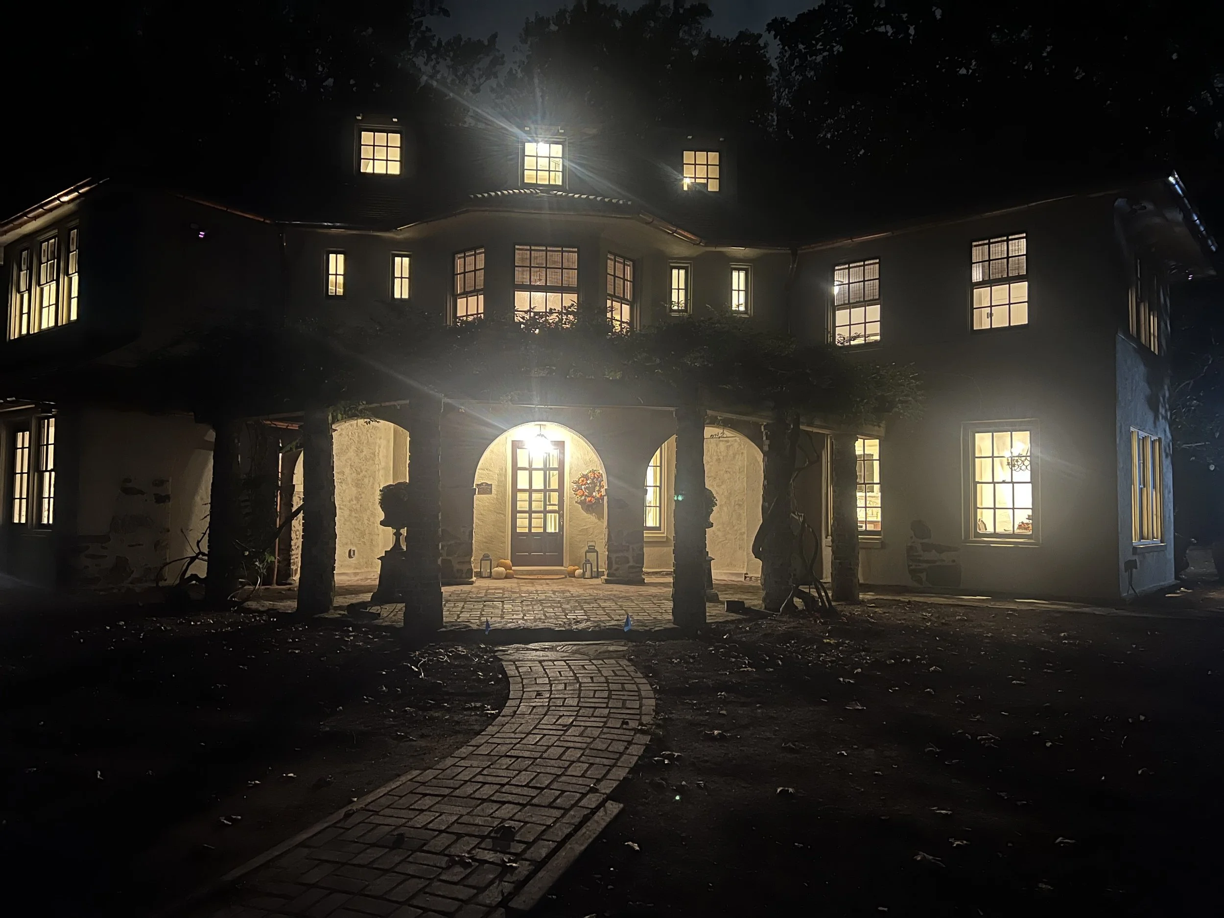 Night view. The landscape is a bit rough until we get new plantings in, but at least we managed a wreath, a few candles, and pumpkins outside the front door for fall.